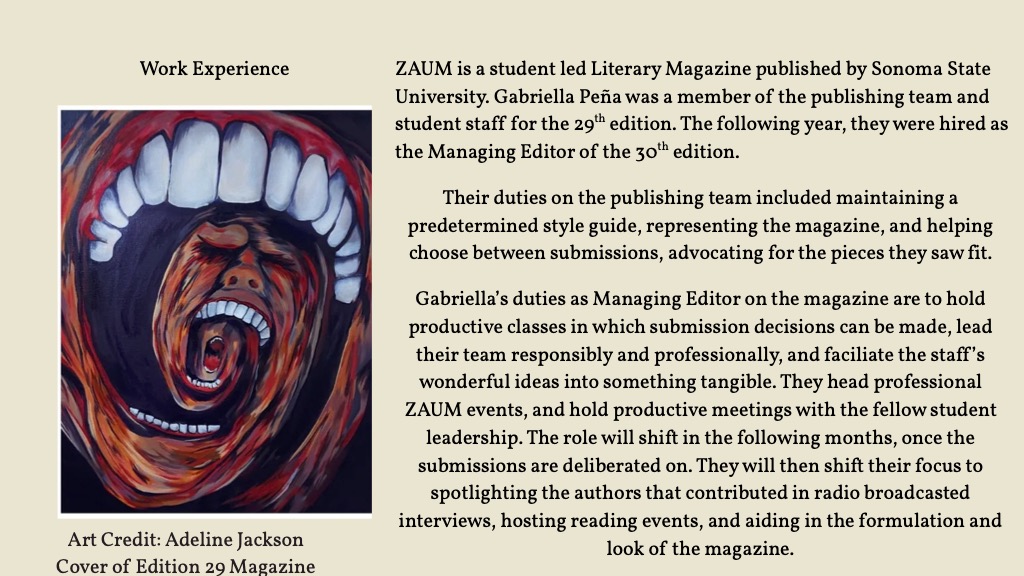 Gabriella Peña (They/She) is a proud Mexican American born and raised in the Bay Area outside Oakland, California. They are attending Sonoma State University and seeking their Bachelor’s degree in English Literature with an emphasis in Creative Writing, which they plan to receive in Spring of 2026. They have always been enamored with reading and writing, from a very young age wanting to pursue such avenues professionally. They are a strong advocate for all creative expression, and harbor a deep desire not only to create, but to support fellow creatives. They are currently working as the Managing Editor for the literary magazine ZAUM, which is student-led and published by Sonoma State University. In addition to this, they are a freelance writer.