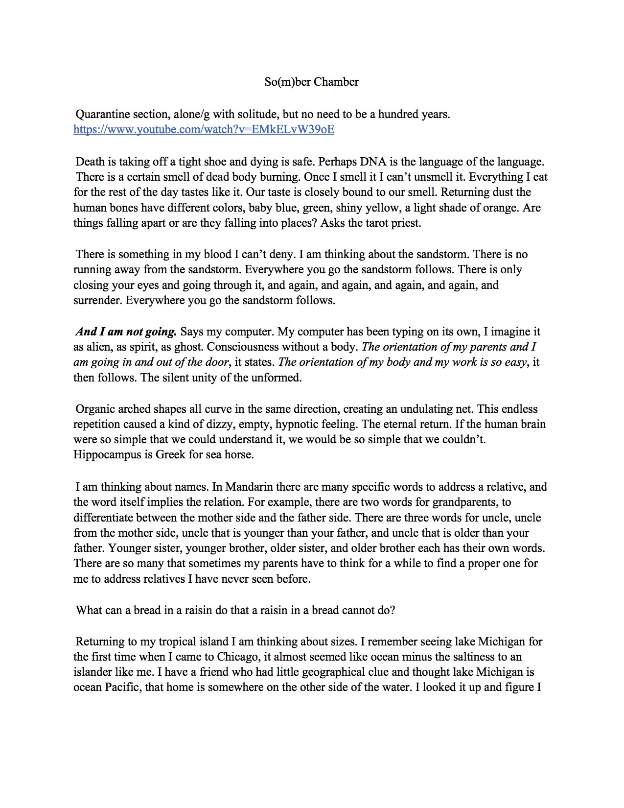 Chia Chun Huang is a Taiwanese writer and dancer, currently based in Chicago, IL. They are interested in making art that is mortal and pedestrian, art that embodies its own demise. They are currently pursuing a BFA degree in performance at School of the Art Institute of Chicago.